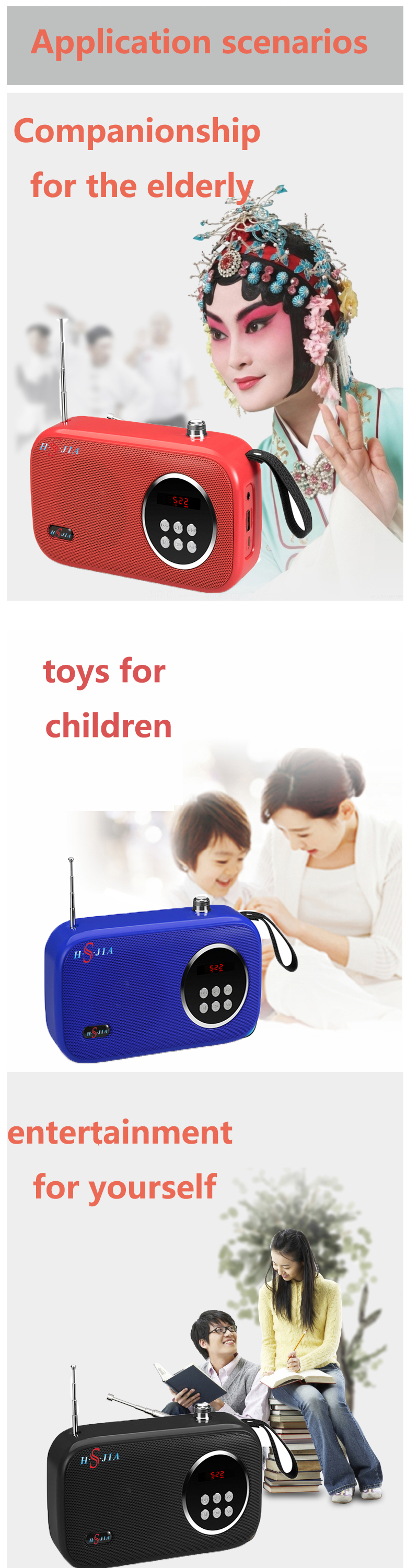 Bluetooth speaker, music player. With USB/TF slot, can play music from USB or TF card. Fm radio, when press pause button, can search radio station automaticlly. With antenna, can get radio function better. With rechargeable battery. Can play. music outdoor freely. Mobile holder to hold mobile when enjoy the music. Louderly sound , with good voice.